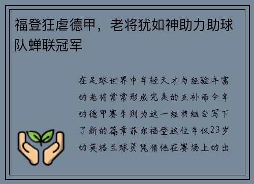 福登狂虐德甲,老将犹如神助力助球队蝉联冠军