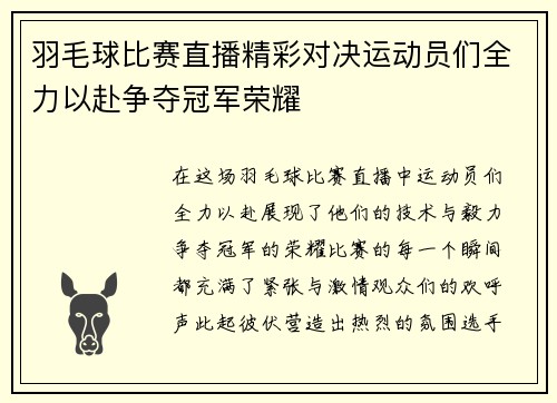 羽毛球比赛直播精彩对决运动员们全力以赴争夺冠军荣耀