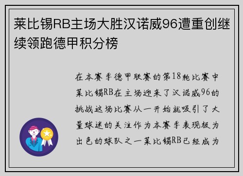 莱比锡RB主场大胜汉诺威96遭重创继续领跑德甲积分榜